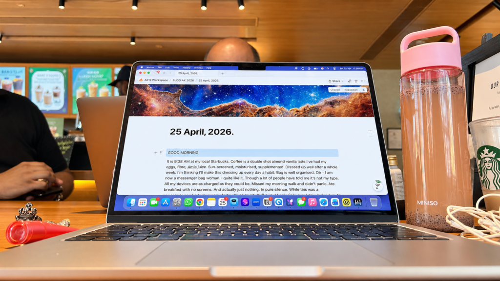 It is 9:38 AM at my local Starbucks. Coffee is a double shot almond vanilla latte.I’ve had my eggs, fibre, Amla juice. Sun-screened, moisturised, supplemented. Dressed up well after a whole week. I’m thinking I’ll make this dressing up every day a habit. Bag is well organised. Oh – I am now a messenger bag woman. I quite like it. Though a lot of people have told me it’s not my type. All my devices are as charged as they could be. Missed my morning walk and didn’t panic. Ate breakfast with no screens. And actually just nothing. In pure silence. While this was a consequence of a fairly messy desk with so much stuff, I could only fit in my plate + being lazy to move stuff to make space for a book or phone or laptop. And I enjoyed it. OM and I call this rawdog eating. Or rawdog sleeping, if it’s sans screen. And oh, I got a very quick rickshaw on my way here. It is my house-help’s birthday and I have tried to call her multiple times so I can wish + get her a cake but she’s on DnD.